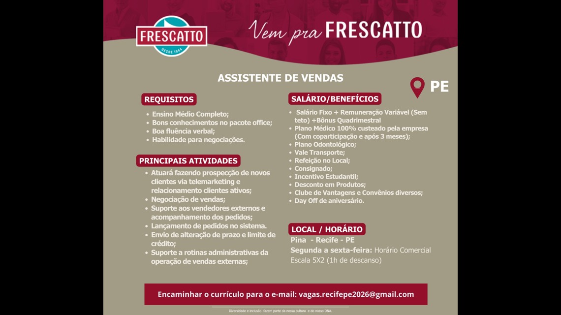 Somos uma empresa feita por pessoas, que acredita em relacionamentos verdadeiros, desenvolvimento profissional e ambiente colaborativo. Trabalhar na Frescatto é fazer parte de uma organização sólida, em constante evolução, que respeita sua história e investe no futuro.